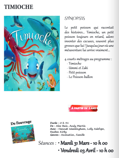 Nous avons eu la chance de bénéficier d’une séance de cinéma au Poiré sur Vie pour le 5e festival du « Livre au ciné ». C’est un festival ouvert aux écoles mais aussi aux familles. Vous pouvez consulter le programme via le lien ci-dessous.